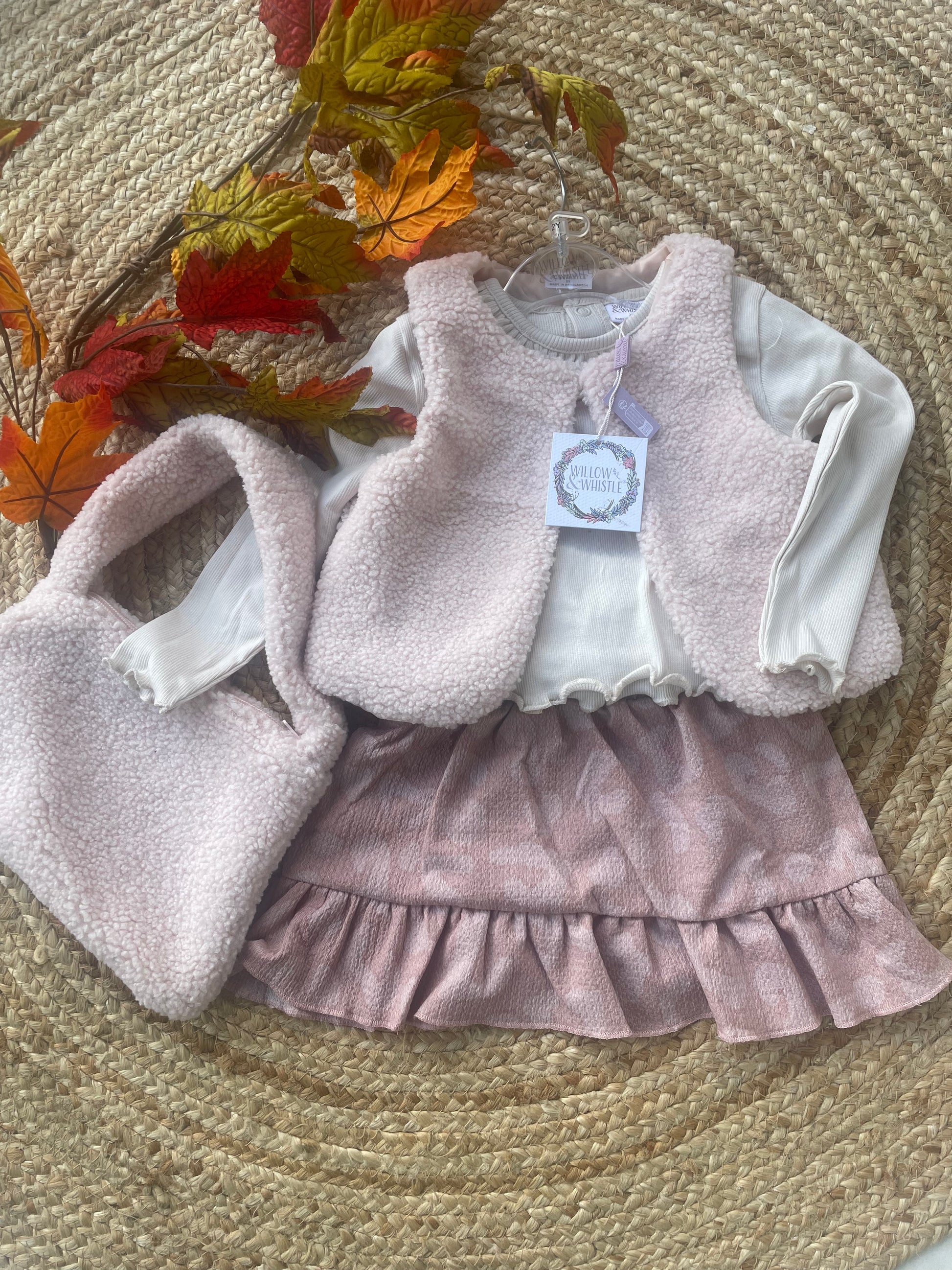 comprising of little elastic waist skirt , long sleeve T and Borg fleece gilet & handbag!